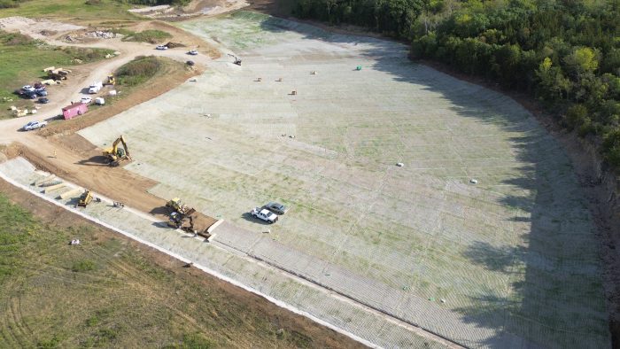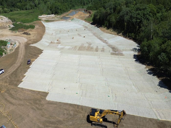 Flexamat Plus FR was selected as the solution. Flexamat is a tied-concrete block mat secured with cross plate percussion anchors and used for permanent erosion control. The ‘Plus FR’ version of Flexamat has 5,000 PSI concrete blocks connected by a bi-axial geogrid with a flame-resistant coating.